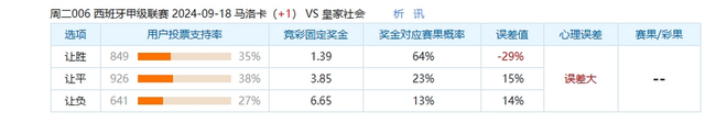 这场比赛中,采纳马洛卡不败的球迷偏少了,唯有35%的球迷采纳了让胜选项,这场比赛中,全球王人看好皇家社会卤莽赢得这场比赛甚而是大捷,不看好马洛卡能在客场保住我方,然则这也与奖金对应赛果概率的64%出入了29%。全球王人更看好皇家社会卤莽得回比赛的得胜。