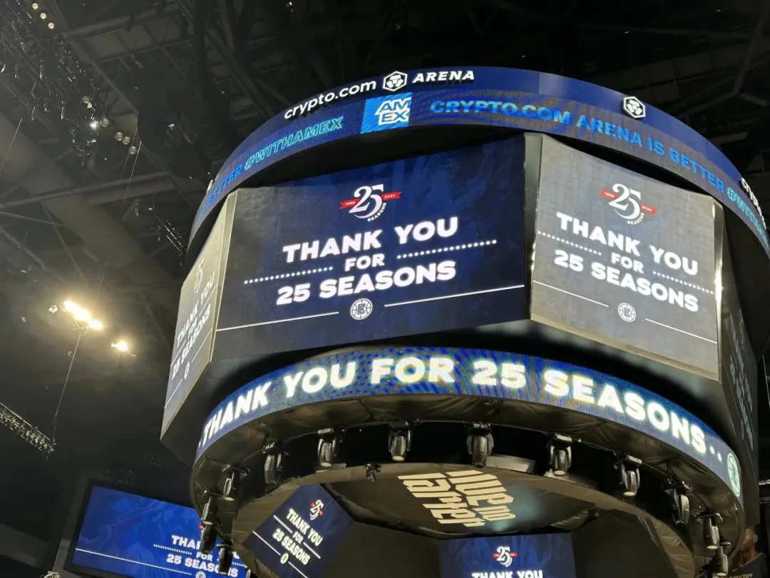 值得一提的是,快船刚打完结在Crypto球馆的终末一场旧例赛,现场大屏幕致意谈:“感谢昔时的25个赛季。”