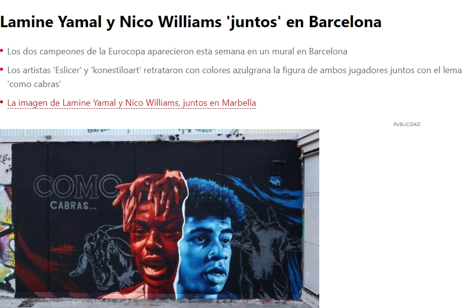 几天前,这幅巨型壁画在巴塞罗那亮相,它被染成了蓝色,拉明是蓝色,尼科是红色。两位绘画艺术家永别是马克-埃斯利克和维克托,他们的艺术名字永别是 "埃斯利克 "和 "科诺斯特罗",他们决定提前将两位双子星在巴塞罗那同框。
