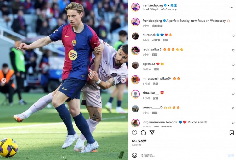 德容也在当天通过社媒晒出比赛照回想收效,并配文:“一个完好的周日,接下来专注于周三。”