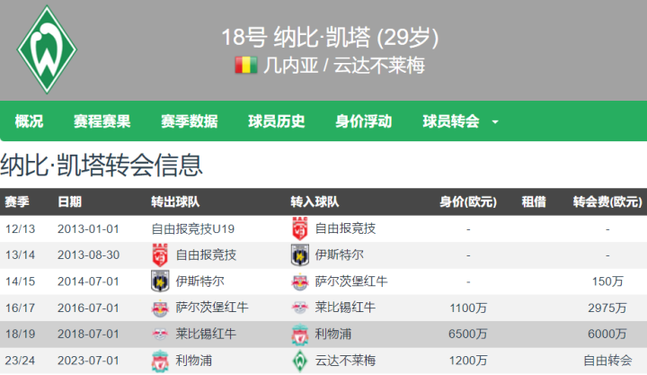 纳比-凯塔也算是球星级别的球员,他于2018年夏窗以6000万欧元的转会费从莱比锡加盟利物浦,其时球员身价高达6500万欧元。纳比-凯塔身披利物浦主力号码8号,但由于伤病的原因(因伤计较缺席630天),发展未达预期。5年之后,纳比-凯塔与利物浦协议到期,以解放转会的神态转头德甲加盟不莱梅。纳比-凯塔也曾没了灵气和实力,但本性还在,上赛季这位几内亚中场因为罢赛,被不莱梅每部禁赛+罚金,德甲仅出场5次。