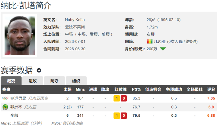 现年29岁的纳比-凯塔,身高1.72米,右脚球员,能踢后腰和前腰,与不莱梅的协议至2026年,现在球员在德转的身价为200万欧元。