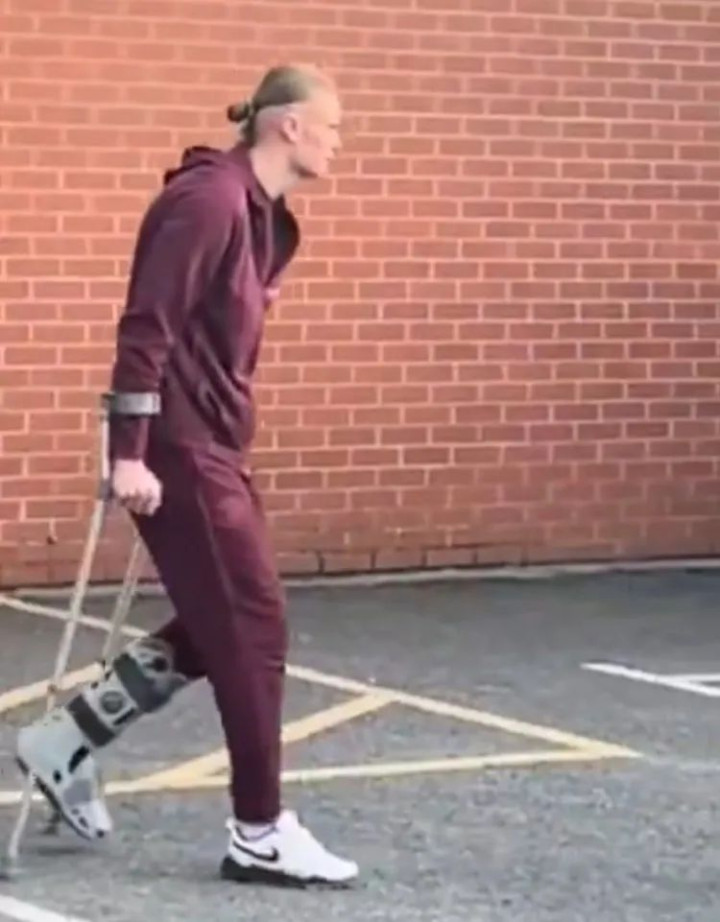 哈兰德离开球场时看起来莫得发达出苦难,但他拄脱手杖,左腿一稔督察靴行走。
