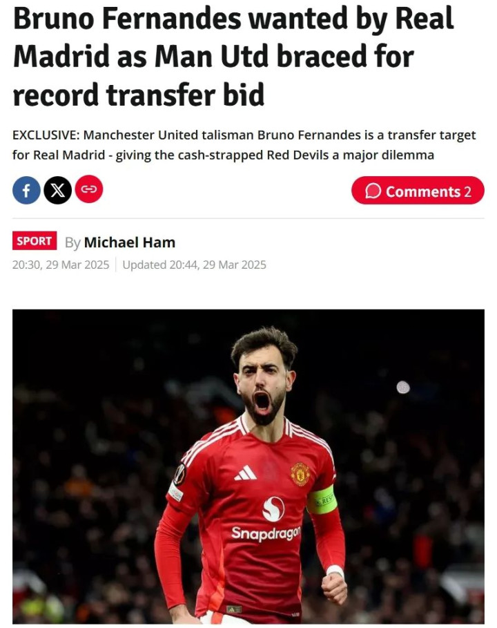 日前英媒《逐日星报》爆猛料,称皇马可能有计划破耗9000万英镑挖角曼联队长B费,以至还是派球探多场老师。