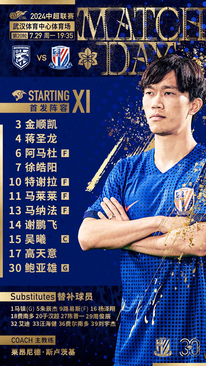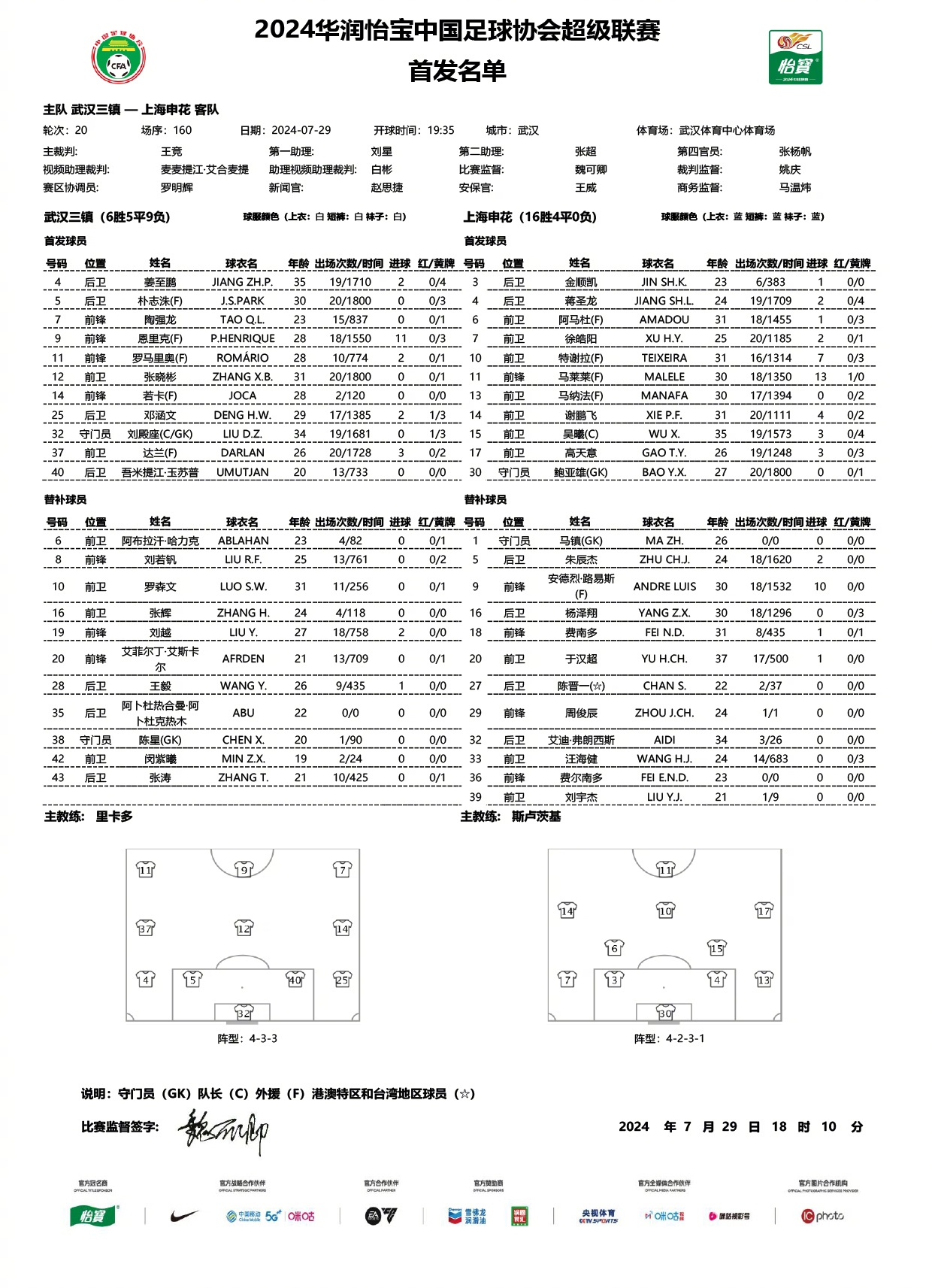 伟德买球2024中超联赛第20轮 武汉三镇vs上海申花 首发名单体育赛事直播